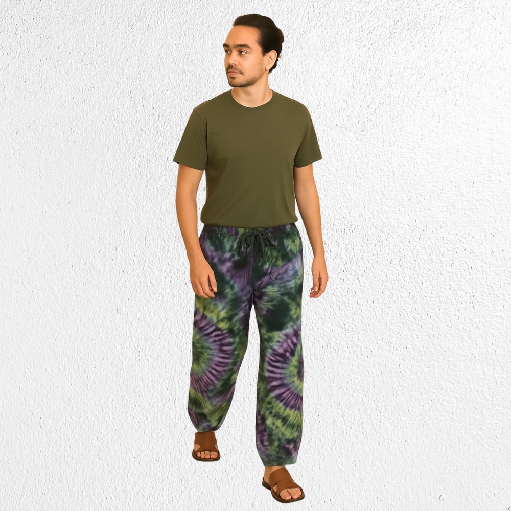 1点ごとに表情が異なる手染めのタイダイ柄が魅力の、インド綿製ユニセックスパンツです。